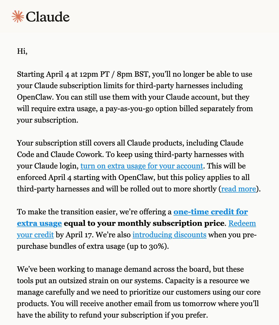On the night of April 3, 2026, Anthropic sent an email to subscribers announcing that third-party harnesses like OpenClaw can no longer use Claude Max subscription limits. Starting April 4 at 12pm PT. That’s less than 24 hours of notice.